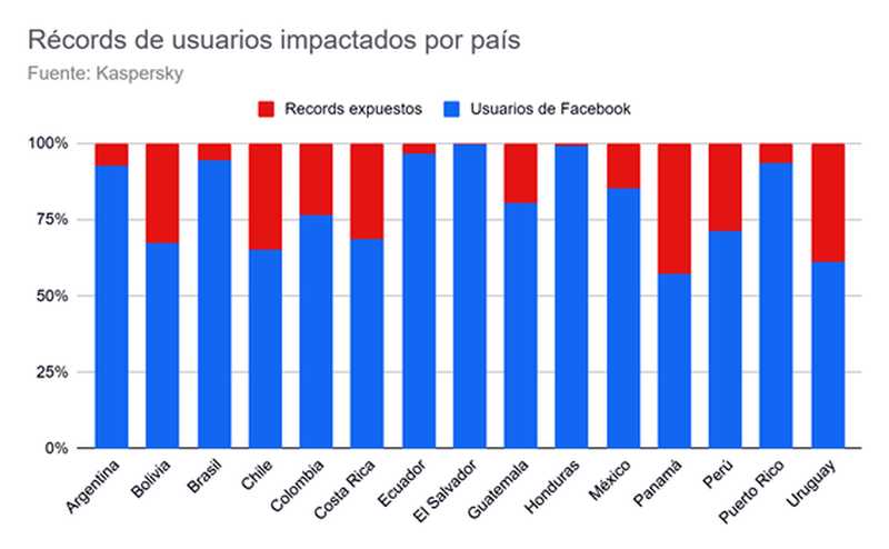 Según el análisis de Kaspersky, la mayor cantidad de datos de Facebook filtrados en la región provienen de usuarios en México, Colombia, Perú, Brasil y Chile. Sin embargo, al analizar el número de datos expuestos en relación al número de usuarios de Facebook por país, los más impactados son los usuarios de Uruguay, Panamá, Costa Rica, Chile y Bolivia (gráfico inferior).