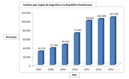Durante el año 2013, 107.305 argentinos eligieron a República Dominicana como destino de vacaciones. Esta cifra muestra un incremento del 3,8% respecto al número de turistas que visitaron el país caribeño en el año 2012, y un aumento del 136,3% si se analiza la evolución de los últimos cinco años (ver tabla abajo).