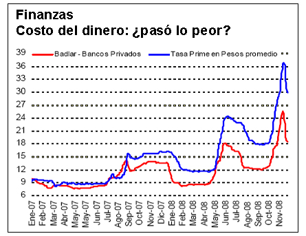 El descenso de las tasas pasivas (la que se pagan por las colocaciones) permitió que el costo de los préstamos a empresas privadas de primera línea (PRIME) pasaran de un 37,7% anual (mediados de noviembre) a un 27,7% anual (segunda semana de diciembre), según datos del Banco Central.