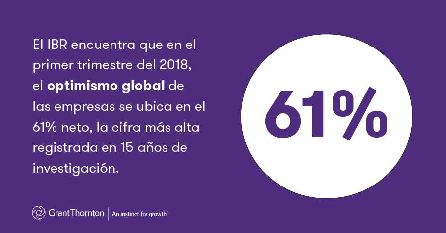 Francesca Lagerberg, responsable de desarrollo de red de Grant Thornton, comenta: «La economía global se está disparando más fuertemente de lo que lo ha hecho en muchos años. Las predicciones económicas son positivas para el corto y mediano plazo. Sin embargo, la historia nos dice que el crecimiento tiende a venir en ciclos, con 2018 siendo el punto más alto en este caso. Las tasas de interés siguen siendo bajas, pero se prevé que aumenten en los próximos dos años. Esto significa que la ventana de financiación barata se está cerrando y las empresas pueden querer pedir préstamos ahora si están pensando en invertir en 2019 o 2020. Este momento representa una ventana de oportunidad para invertir en el futuro. Invertir más en I + D o en nuevas tecnologías no significa que los salarios de los trabajadores sufran. Estamos experimentando un cambio fundamental en los negocios en muchos frentes. El futuro de las empresas requerirá comprometerse con los trabajadores para aprovechar al máximo las oportunidades que surgen. Las empresas que equilibran la inversión en infraestructura e ideas con trabajadores empoderadores tendrán la mejor oportunidad de cosechar los beneficios a futuro. Y de mantenerse resistente cuando las condiciones económicas inevitablemente cambien”.