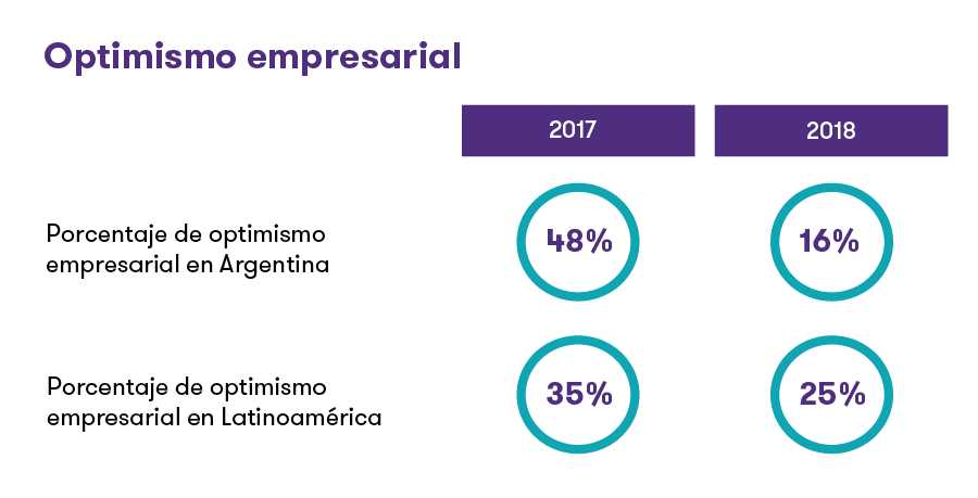 Por un lado, el optimismo empresarial en Argentina cayó drásticamente en el primer trimestre, alcanzando un 16% neto, con una caída de 32 puntos porcentuales en relación al año pasado. Esta línea coincide con Latinoamérica en general, donde el optimismo cayó 10 puntos porcentuales hasta el 25% en el primer trimestre de 2018. Las expectativas de aumento de las exportaciones en Argentina han disminuido en 6 puntos porcentuales hasta alcanzar el 12% neto, mientras que las expectativas de un mayor empleo han caído en 22 puntos hasta un 20% neto, un mínimo en casi dos años. Al mismo tiempo, el 10% neto de las empresas espera mayors ganancias durante el próximo año.
