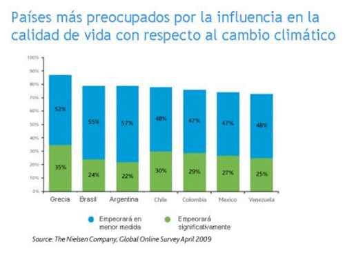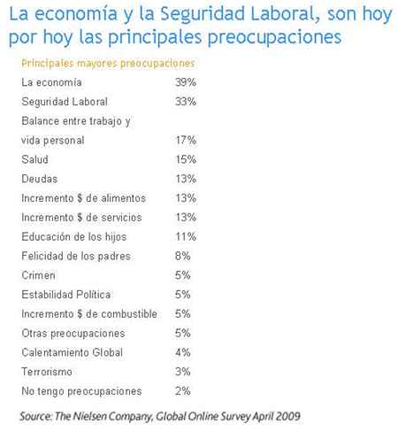 Hace un año exactamente, issues como el problema ambiental, la salud y el balance entre la vida personal y laboral, eran las primeras en el ranking de mayores preocupaciones en la encuesta global on line que realiza The Nielsen Company todos los años en varios países del mundo. En abril de 2009, en una nueva edición de esta encuesta on line realizada en más de 50 países, la economía y la seguridad laboral, son las preocupaciones que mantienen alerta a los consumidores alrededor del mundo, ubicando al calentamiento global en el puesto número 14 de este ranking.
