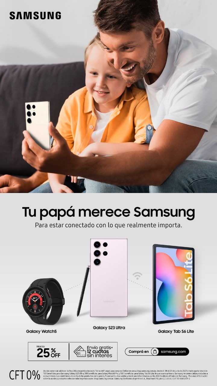 Sabemos que le hacés saber a tu papá que es especial cada día con un llamado, un abrazo, compartiendo un buen asado, o un momento de recuerdo. Te traemos una selección de productos que van a hacer de esos instantes un poco más especiales. Del 5 al 20 de junio Samsung Argentina celebra el día del padre con grandes beneficios y cuotas sin interés en sus lineales de celulares, tablets, wearables, pantallas y electrodomésticos.