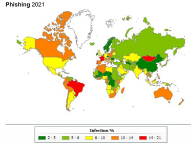 Algo curioso que reveló el Panorama de Amenazas en América Latina 2021 es que los ataques de phishing (mensajes fraudulentos) han disminuido. Sin embargo, varios países de la región se encuentran entre los más atacados del mundo. Considerando la proporción de usuarios atacados durante los primeros ocho meses del año, Brasil figura en el primer lugar con 15,37% de usuarios que registraron algún intento de ataque. Le sigue Ecuador (13,36%), Panamá (12,60%), Chile (11,90% y Colombia (11,09%). Cabe destacar que Venezuela (7,19%) y la República Dominicana (5,62%) figuran entre los países con la menor cantidad de ataques de ingeniería social a nivel mundial.