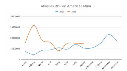 “Este tipo de ataque explota vulnerabilidades presentes en las tecnologías de acceso remoto o intenta adivinar las contraseñas para acceder a una máquina o servidor conectado a Internet e ingresar a la red corporativa para robar datos o extorsionar a su víctima. Al comparar los primeros ocho meses de 2021 con el mismo periodo del año anterior, vemos un aumento del 78% de este tipo de ataques”, comentó Bestuzhev. Los países más atacados son Brasil (más de 5 millones de intentos de ataque este año), Colombia (1,8 millones), México (1,7 millones), Chile (1 millón) y Perú (507 mil). El informe también destaca que Costa Rica (378%), Venezuela (113%) y Argentina (91%) son los países con mayor crecimiento en ataques de RDP en comparación al año pasado.