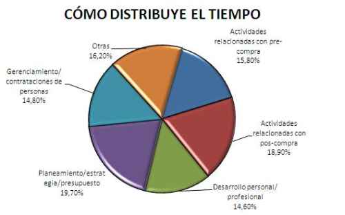 De acuerdo al estudio mencionado, la cantidad de horas, en promedio, que trabaja un ejecutivo que toma decisiones de compra de IT es de 9,2 horas diarias. El gráfico siguiente muestra cómo distribuye el tiempo.