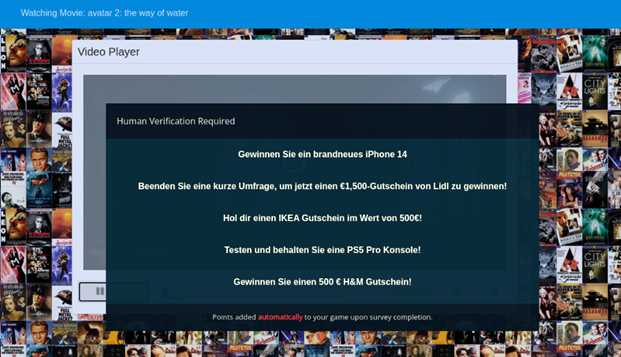 En esta estafa se dirige a los usuarios a un sitio web fraudulento donde se les pide que confirmen su identidad, para lo cual deben completar encuestas que ofrecen una variedad de premios. Una vez que el usuario hace clic en el botón ‘play’, recibe un mensaje donde se le felicita por ganar un premio de su elección, que puede incluir una recompensa financiera, cupones para H&M o IKEA, o una consola PS5.