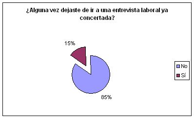 En primer lugar, se les preguntó a los encuestados si ¿alguna vez dejaron de ir a una entrevista laboral ya concertada?, el 85% respondió que no y el 15% que sí, lo que significa que aunque la porción de desertores no sea muy amplia, existe la ausencia a las entrevistas pactadas lo cual perjudica la imagen del posible candidato.