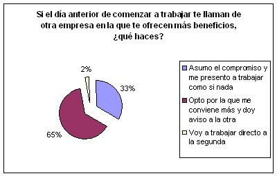 Para poner a los argentinos en situación se les planteó si el día anterior de comenzar a trabajar los llaman de otra empresa en la que les ofrecen más beneficios, ¿qué harían?, el 64% optaría por la que más le conviene y le daría aviso a la otra, el 33% asumiría el compromiso y se presentaría a trabajar como si nada, mientras que sólo el 2% iría a trabajar directo a la segunda.