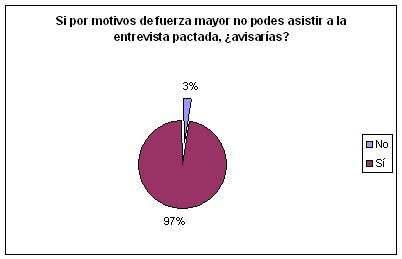 Por último, el 97% de los encuestados afirmó que si por motivos de fuerza mayor no puede asistir a una entrevista pactada da aviso, mientras que el 3% sostiene que no.