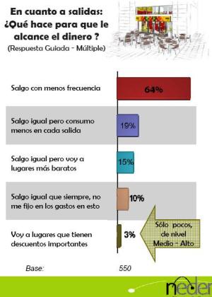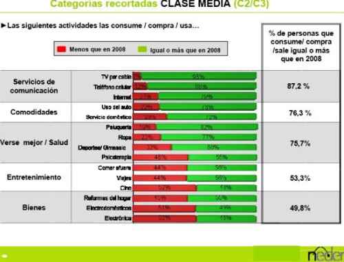 En otra investigación, la consultora indagó sobre los gastos acumulados por las familias a junio de 2009. En la misma, un 87% admite que este año gastaron igual o más en TV por cable, teléfono celular e Internet; seguido por un 76% que declaró lo mismo en lo que corresponde al uso del auto y servicio doméstico.