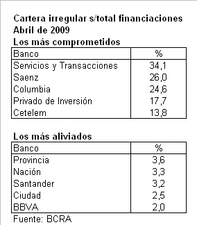 Por un lado se ubican aquellas con elevados niveles de morosidad, liderados por los bancos Columbia, Saenz y de Servicios y Transacciones (Credilogros), con porcentajes que van del 24,6% al 34,1 por ciento.
