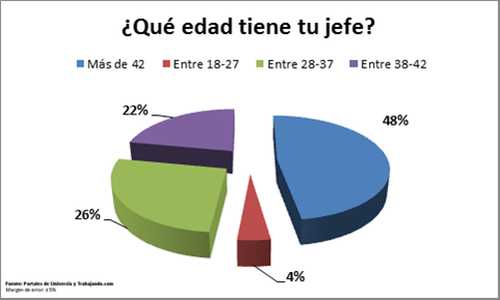 Según la cuarta Encuesta de Empleo realizada por Universia (http://www.universia.net), la red de universidades presente en 23 países de Iberoamérica, y Trabajando.com (http://www.trabajando.com), una comunidad laboral formada por una amplia red de sitios asociados, cuya temática fue Relación con tu jefe, el 26% respondió que su superior tiene entre 28 y 37 años, poco por debajo de la mayoría (48%) que reveló que su jefe tiene más de 42 años.