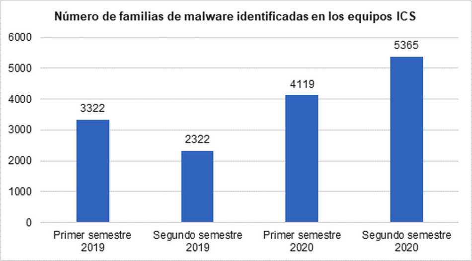 En total, se bloquearon amenazas procedentes de 5.365 familias de malware distintas en los equipos ICS, lo que representa un aumento del 30% en comparación con los primeros meses de 2020. Entre las amenazas más frecuentes se encontraron las puertas traseras (peligrosos troyanos que obtienen el control remoto del dispositivo infectado), spyware (programas maliciosos diseñados para robar datos), y otros tipos de troyanos, así como scripts y documentos maliciosos.