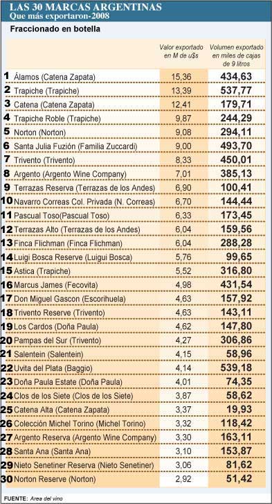 Sin embargo, si se considera el ranking por el valor del negocio, este producto de la bodega Baggio se ubicaría recién en el puesto número 22. Así, el gran dueño del las exportaciones fue la bodega Catena Zapata, que sólo con su clásico vino Álamos, amasó unos u$s15 millones.