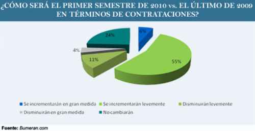 En un relevamiento realizado por el portal de clasificados de empleo Bumeran entre casi 400 compañías, el 55% de los encuestadas respondió que en el primer semestre de 2010 las contrataciones se incrementarán “levemente” (Ver gráfico a continuación).