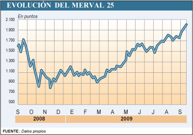 En lo que va del año, el conjunto de acciones que conforman el Merval 25 (constituido por las 25 primeras acciones del mercado local por volumen operado) muestra un aumento promedio del orden del 85 por ciento.