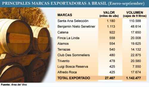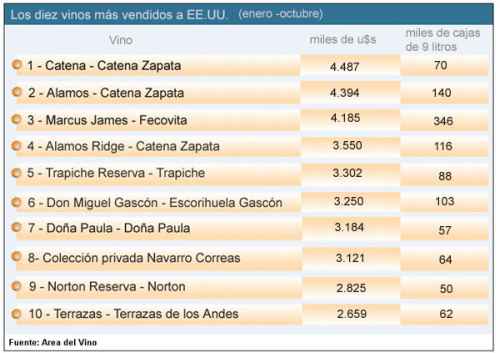 La etiqueta que se lleva todos los laureles es el Catena. Durante los diez primeros meses del año se despacharon al norte 70.000 cajas por un valor de 4,4 millones de dólares.