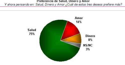 Al indagar entre los argentinos cuál deseo es el que prefieren entre salud, dinero y amor, la proporción de personas que eligen la salud crece entre los mayores de 64 años y las personas de menor nivel socioeconómico (77% vs. 66% en la case alta). En cambio, quienes prefieren el amor son más frecuentes a medida que aumenta el nivel socioeconómico (21% en la clase más alta, contra 12% en la más baja) de los entrevistados.