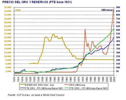 A partir de ese momento, la moneda norteamericana no guarda relación con nada. Es una moneda de papel. ¿Cuanto vale en el largo plazo? El valor del papel en el que está impresa: la inflación lo deteriora completamente. En 100 años, con la inflación anual estadounidense desde 1972, el valor de 100 dólares pasaría a ser de U$S 0,9. Es decir, una pérdida del 99,1 % del valor. El fin de esta convertibilidad implicó que la cotización del metal quedará librada a las fuerzas del mercado, por lo que ha tenido fluctuaciones importantes. Los aumentos del oro reflejaron los momentos de incertidumbre internacional y sus momentos mas bajos, la calma de los mercados.