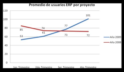En relación a sus recursos humanos, dichas compañías emplean un promedio de 187 empleados, siendo la más pequeña una microempresa de 5 colaboradores y la más grande una empresa con 1.500 personas. Vale aclarar que el promedio de usuarios del Software ERP a implementar, es de 64. El siguiente gráfico muestra el promedio de usuarios por proyecto de trimestres anteriores.