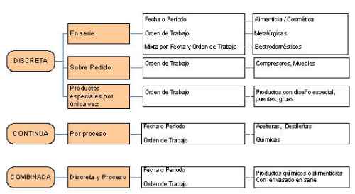 Hablando específicamente de los ERP que se especializan en empresas industriales, podemos tener diferentes esquemas de funcionamiento. En el universo de empresas de producción existen múltiples tipos de producción que podemos resumir, según se ve en el diagrama adjunto en: discreta, continua y combinada que se conjugan además con; producción en serie, sobre pedido y productos especiales.