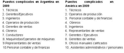 Los diez puestos de trabajo que los empresarios tienen más dificultad para cubrir en América y en la Argentina en 2009, por orden de dificultad, son: