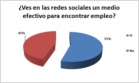 Internet entrega una serie de herramientas que facilitan la búsqueda de empleo y si bien las redes sociales no han sido pensadas 100% con este fin, cada vez se reconoce más efectividad en ellas en este sentido, así lo demuestra el 55% de los argentinos que está de acuerdo con esta afirmación, por sobre el 45% que no lo está.