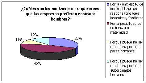 Frente a esta situación, el 46% de las encuestadas cree que una de las principales razones por las que las empresas prefieren contratar hombres en lugar de mujeres, es por las molestias que pueden generar el embarazo y la maternidad. Por otro lado, el 32% opina que la causa consiste en la dificultad de compatibilizar responsabilidades laborales y familiares, mientras que el 12 y el 11% creen que se trata de la posibilidad de no ser respetada, ya sea por sus subordinados hombres o por sus pares hombres, respectivamente.