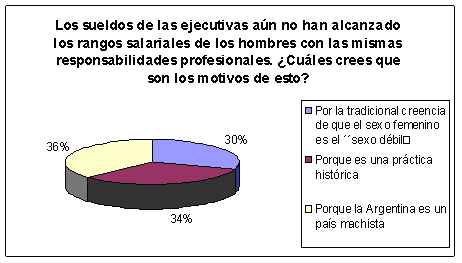 Por otra parte, es sabido que los sueldos de las ejecutivas aún no han alcanzado los rangos salariales de aquellos hombres que poseen las mismas responsabilidades profesionales. Para el 36% de las mujeres, esto se debe a que la Argentina es un país machista. El 34% coincidió en que se trata de una práctica laboral histórica y el 30% lo vinculó con el concepto de que a la mujer se la ve como el “sexo débil”.