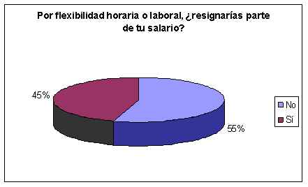 Frente a la pregunta: “Por flexibilidad horaria o laboral, ¿resignarías parte de tu sueldo?”; el 55% aseguró que no lo haría, en tanto el 45% restante afirmó que lo haría.