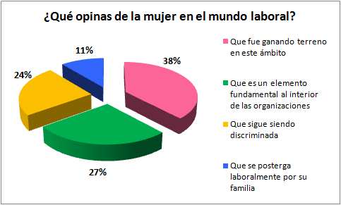 Trabajando.com, a través de una encuesta realizada a más de 3 mil personas, quiso saber qué opinan los argentinos acerca de la mujer en el mundo laboral, encontrándose con que un 38% considera que fue ganando terreno en ese ámbito, un 27% cree que la mujer es un elemento fundamental en el interior de las organizaciones, un 24% piensa que sigue siendo discriminada y finalmente, un 11% piensa que la mujer se posterga laboralmente por su familia.