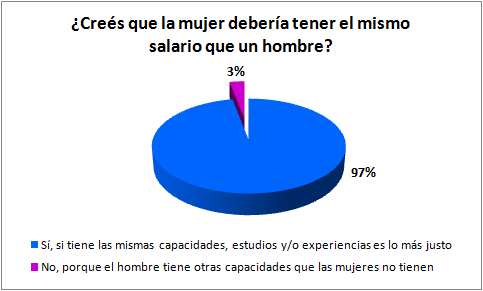 Que el hombre gane más que la mujer no es una sorpresa para nadie, pero, ¿creen los argentinos que la mujer debería tener el mismo salario que un hombre? A la pregunta recién planteada, un 97% de los encuestados opina que teniendo las mismas capacidades, estudios y/o experiencias, lo más justo es que ganen lo mismo, mientras que sólo un 3% no está de acuerdo.