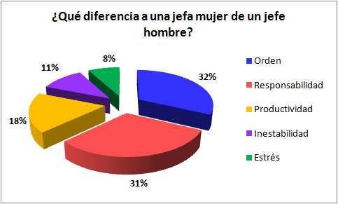 Al consultarles sobre lo que diferencia a una jefa mujer de un jefe hombre, un 32% estuvo de acuerdo con que lo que los diferencia es el orden, un 31% dice que es la responsabilidad, un 18% la productividad, un 11% la inestabilidad y un 8% piensa que es el estrés.
