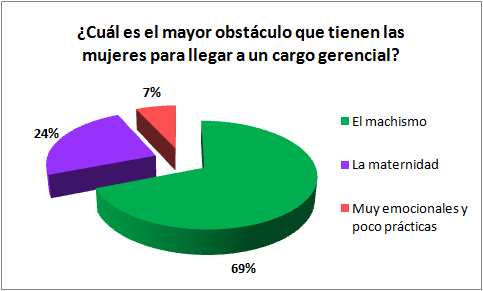Según el 69% de los argentinos encuestados, el machismo es el mayor obstáculo que tienen las mujeres para llegar a un puesto gerencial, bastante lejos, un 24% piensa que es la maternidad y finalmente, un 7% dice que las mujeres son muy emocionales y poco práctica, lo que sería el mayor obstáculo.