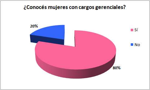 A pesar de las múltilples tareas que realizan las mujeres una vez dentro del mundo laboral y todo lo que esta encuesta ha arrojado, nada parece ser obstáculo para que las muejeres cada día vayan tomando más protagonismo dentro del mercado. Así quedó demostrado en la última pregunta realizada en el sondeo, donde un 80% de los argentinos aseguran conocer a mujeres con cargos gerenciales y un 20% dice no conocer.