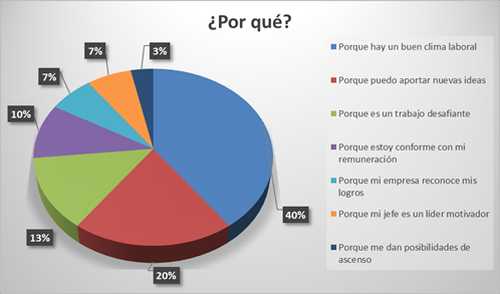 ¿Cuáles son las razones principales para que las personas se sientan a gusto con su lugar de trabajo?, el 40% dijo que se sentía feliz en su trabajo porque hay un buen clima laboral, un 20% porque puede aportar nuevas ideas, un 13% porque es un trabajo desafiante, un 10% porque está conforme con su remuneración, un 7% porque su jefe es un líder motivador, un 7% porque la empresa reconoce sus logros, y un 3% porque le dan posibilidades de ascenso.
