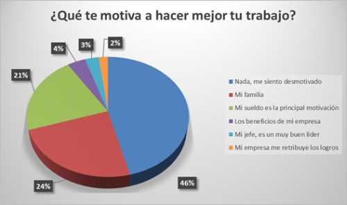 El desempeño de las personas depende en gran parte del grado de satisfacción que posean, donde a su vez ésta obedece a factores tanto internos como externos. Los internos son aspectos que determinan a una persona, mientras que los externos son aquellos que se relacionan con el trabajo. Pero, ¿qué te motiva a hacer mejor tu trabajo? Las cifras son preocupantes, ya que el 46% dijo que nada, ya que se sentía desmotivado, un 24% dijo que su familia, para un 21% su sueldo, un 4% los beneficios de su empresa, un 3% su jefe, porque es un muy buen líder y un 2% su empresa, ya que le retribuye los logros.