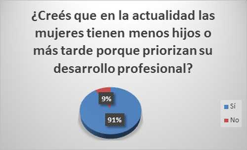 La inserción de la mujer al trabajo ha significado un cambio en las prioridades de las etapas de la vida, donde la maternidad ha pasado a segundo plano. Carlos Quintans, especialista del Instituto Médico Halitus, reconoció que “postergar la maternidad es un fenómeno que se está dando cada vez más en todo el mundo por distintos motivos”. Y así quedo de manifiesto, ya que el 91% de las encuestadas dijo que las mujeres tenían menos hijos o lo retrasaban porque priorizaban su desarrollo profesional.