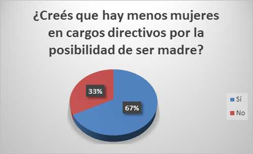 Por otro lado, llama la atención que a pesar de que la inserción de la mujer al trabajo lleva bastantes años, la presencia femenina en cargos directivos aún es significativamente menor. Para un 67% de las encuestadas esto se debe principalmente por la posibilidad de ser madre.