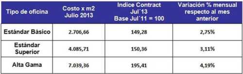 Contract, la empresa regional líder en conceptualización, diseño y construcción de espacios de trabajo, anunció los resultados del Índice Contract para el mes de julio de 2013. Este indicador registra el costo por m2 de construcción del interior de oficinas corporativas, en base a tres categorías establecidas de acuerdo a la calidad de sus terminaciones y sus instalaciones técnicas en: Estándar Básico, Estándar Superior y Alta Gama.