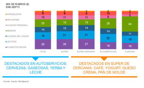 En cuanto al mix de rubros, mientras en el super de cercanía se destaca café, yogurt, queso crema y pan de molde, en el autoservicio lo hacen cervezas, gaseosas, yerba mate y leche.