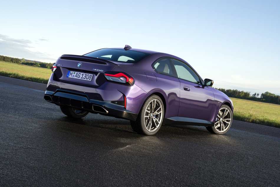 Las dimensiones exteriores del nuevo deportivo compacto proporcionan el punto de partida ideal para una excelente dinámica de conducción. Una longitud del vehículo de 4.537 milímetros y un ancho de 1.838 milímetros representan incrementos con respecto a las medidas del modelo predecesor de 105 y 64 milímetros, respectivamente. Sin embargo, el nuevo vehículo se encuentra 28 milímetros más bajo, con una altura del vehículo de 1.390 milímetros. Otros factores en el aspecto poderoso y atlético del nuevo BMW Serie 2 Coupé son su distancia entre ejes, que ahora es 51 milímetros más larga con 2.741 milímetros, y en ancho de vías de 1.575 milímetros (un aumento de 54 milímetros) en el eje delantero y 1.587 milímetros (un aumento de 31 milímetros) en el eje trasero (BMW M240i xDrive Coupé: +63 milímetros en la parte delantera; +35 milímetros en la parte trasera) son ideales para excelentes dinámica en curvas.