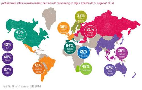 El outsourcing es menos frecuente en el sudeste de Asia (26%), Europa oriental (31%) y los países nórdicos (33%). Por el contrario, más de la mitad de las empresas del sur de Europa (64%) y América Latina (51%) actualmente ya utiliza proveedores de outsourcing o planea hacerlo.