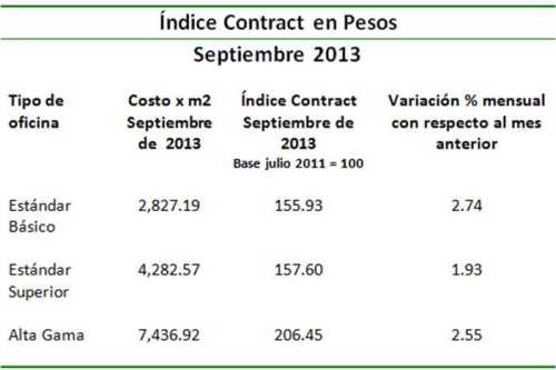 Contract, la empresa regional líder en conceptualización, diseño y construcción de espacios de trabajo, anunció los resultados del Índice Contract para el mes de septiembre de 2013. Este indicador registra el costo por m2 de construcción del interior de oficinas corporativas, en base a tres categorías establecidas de acuerdo a la calidad de sus terminaciones y sus instalaciones técnicas en: Estándar Básico, Estándar Superior y Alta Gama.