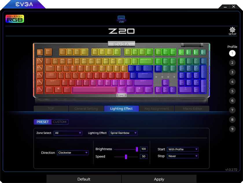 Para aprovechar al máximo sus productos, EVGA lanzó el software EVGA Unleash RGB, el cual permite configurar la iluminación RGB tecla por tecla de sus teclados y realizar asignaciones de teclas personalizadas tanto en el Z15 como en el Z20. Además en el modelo Z20 permite configurar sus teclas macro, la iluminación de su barra lateral, y el comportamiento en base a la detección del sensor TOF, ofreciendo una gran cantidad de personalizaciones para tu teclado.