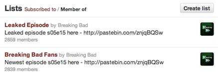 Imagen 2. Listas de Twitter usadas en spam de “Breaking Bad”