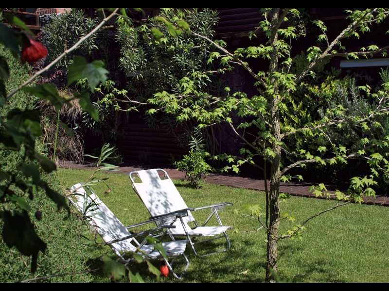 Planta baja: comedor con cocina integrada, estar con diván cama, baño con bañera y deck con parrilla.
