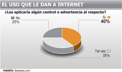 En esta línea, una encuesta realizada por el portal de empleos online Bumeran reveló que el 36% de las empresas sondeadas no tiene control sobre el uso que le dan a Internet sus empleados en la oficina, mientras que el 33% dijo que tiene un control relativo y el 31% aseguró que sí lo regula.