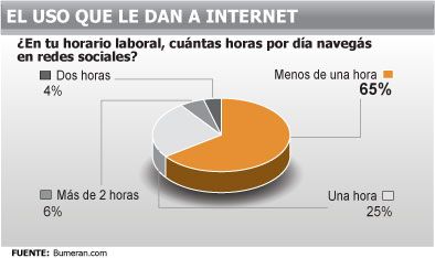 El relevamiento de Bumeran indagó, a su vez, la conducta de los empleados, quienes en su gran mayoría (65%) dijeron que navegan en redes sociales a diario, aunque menos de una hora por día. (Ver infografía)